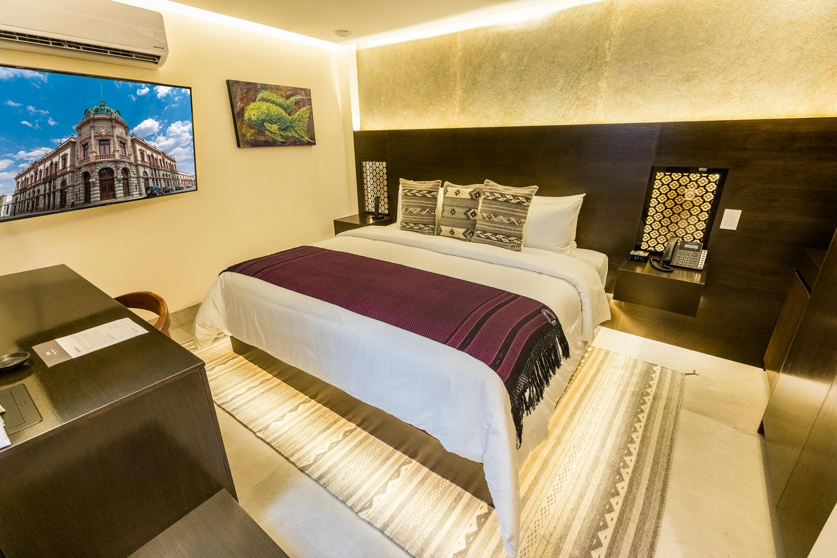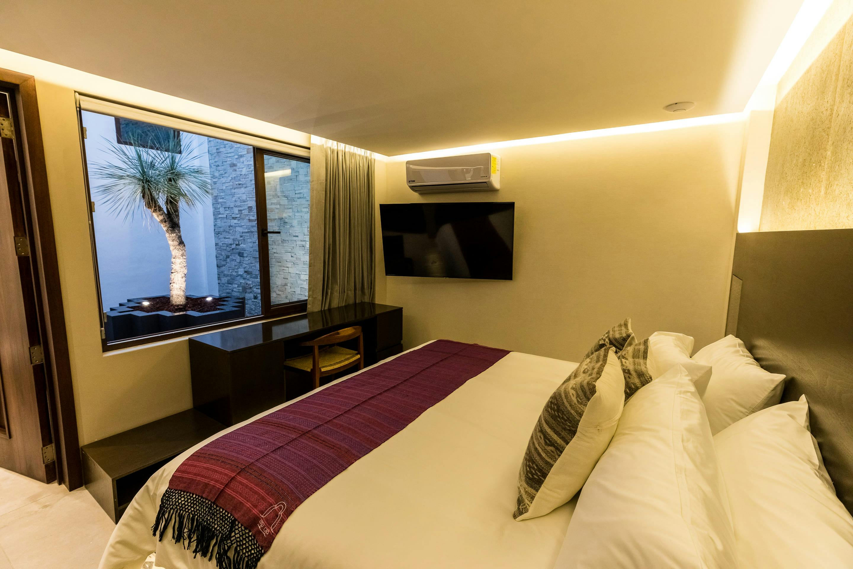 Room with King size bed, full bathroom, safe, air conditioning and heating, view of the Oaxacan-style interior garden, smart TV, digital video and lighting control system, minibar, iron, hair dryer, bathrobe, slippers, L'Occitane amenities, coffee maker, Wi-Fi, complimentary bottle of mezcal and bottled water, laundry service with additional cost, airport-hotel-airport transfer for all our guests. 100% cotton guaranteed soft, satin pillows and sheets, pets allowed.