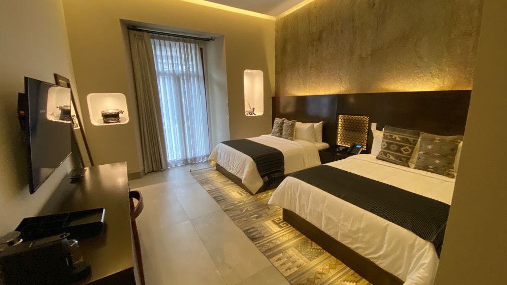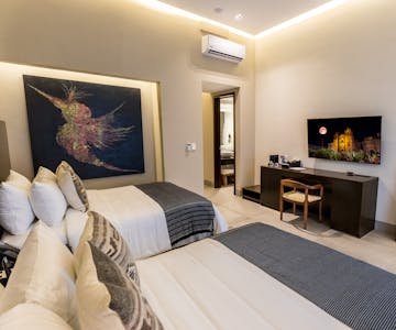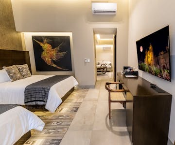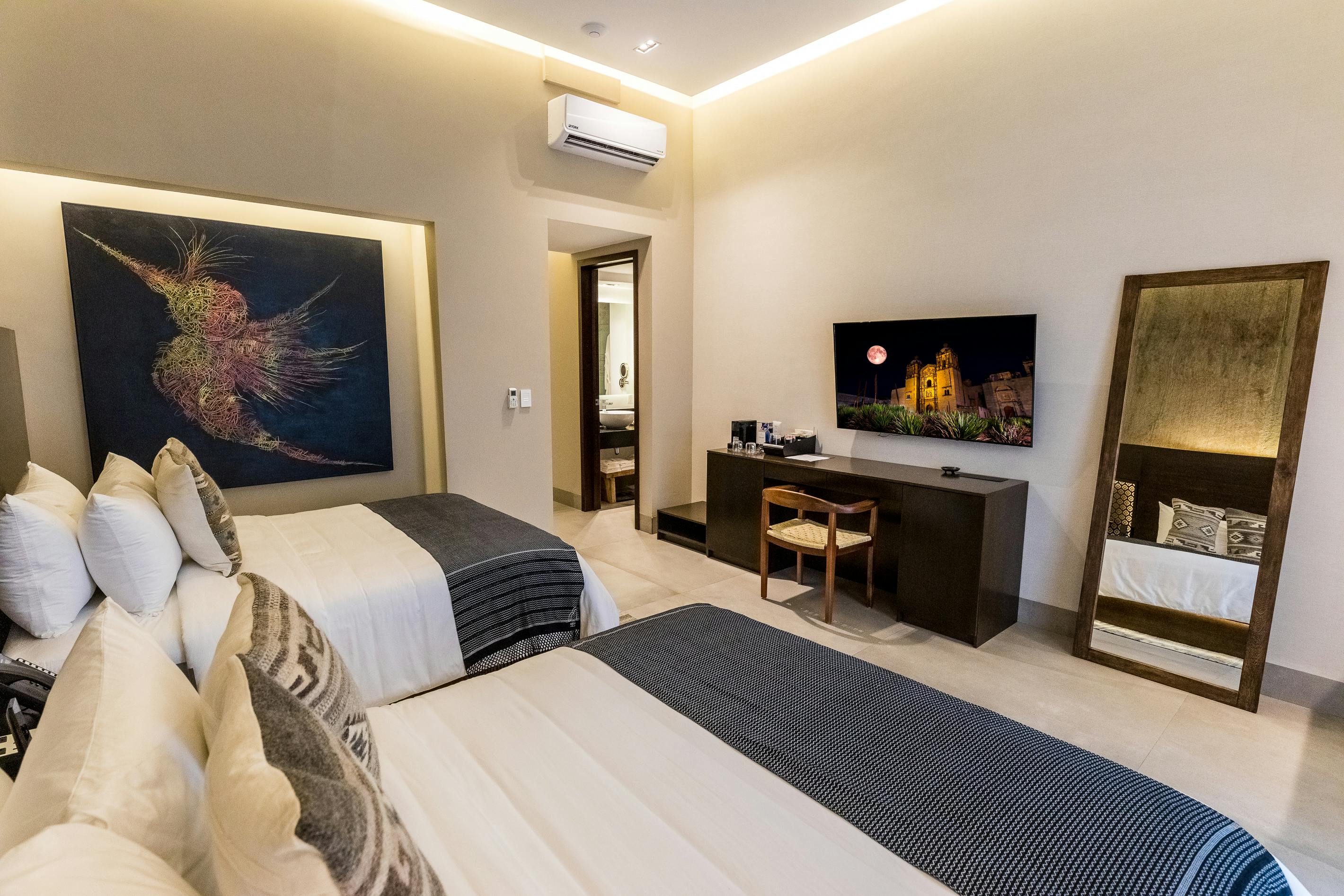 Room with two Queen size beds, full bathroom, with a living room, street view, safe, air conditioning and heating, smart TV, digital lighting and video control system, minibar, iron, hair dryer, dressing gown. bathroom, slippers, L'Occitane amenities, coffee maker, wifi, complimentary bottle of mezcal and bottled water, laundry service with additional cost, airport-hotel-airport transfer for all our guests. 100% cotton guaranteed soft, satin pillows and sheets, pets friendly.